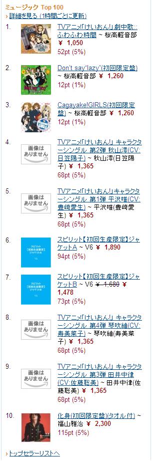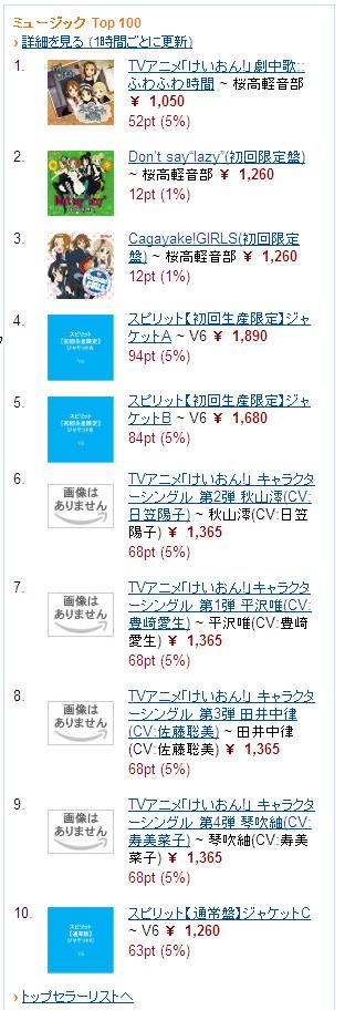 ※キャプチャー画像はこちら 何と、『けいおん!』関連作が7作ランクイン(しかもTOP3独占)。更に12位にはサントラも。恐ろしい人気ぶりだ…。 現在1位の「ふわふわ時間(タイム)」、流石に主題歌CDには及ばないとは思うのですが、やはりそれなりには売れるのでしょうか。気になるところです。個人的には、初動で3万枚程度(主題歌CDの半分程度)と見ていますが。 それと6~9位の一連のキャラクターシングルは、純粋にキャラ人気の高い順と見てよいのでしょうか? ちなみに、4・5・10位は6月17日発売予定のV6の新曲なので、この時点でのTOP10は『けいおん!』関連とV6だけというひどい偏りっぷりに…。 (追記) 5月9日20時の時点で、『けいおん!』関連作はTOP5を独占。また、8・9位が入れ替わっています。(→キャプチャー画像)